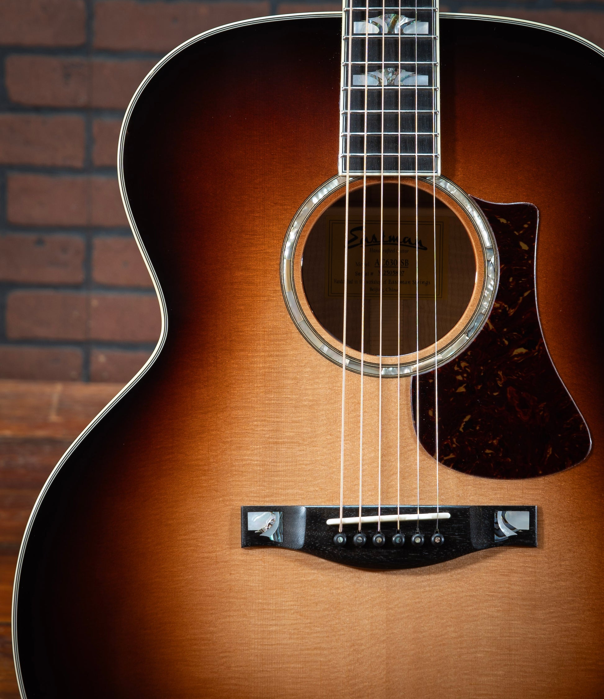 Bring stage-level presence to your performance with the Eastman AC630-SB — a jumbo acoustic that marries powerful voice, refined looks, and Eastman’s build precision. The “SB” denotes the sunburst finish, which complements the visually striking combination of flamed maple back/sides and a solid Engelmann spruce top.