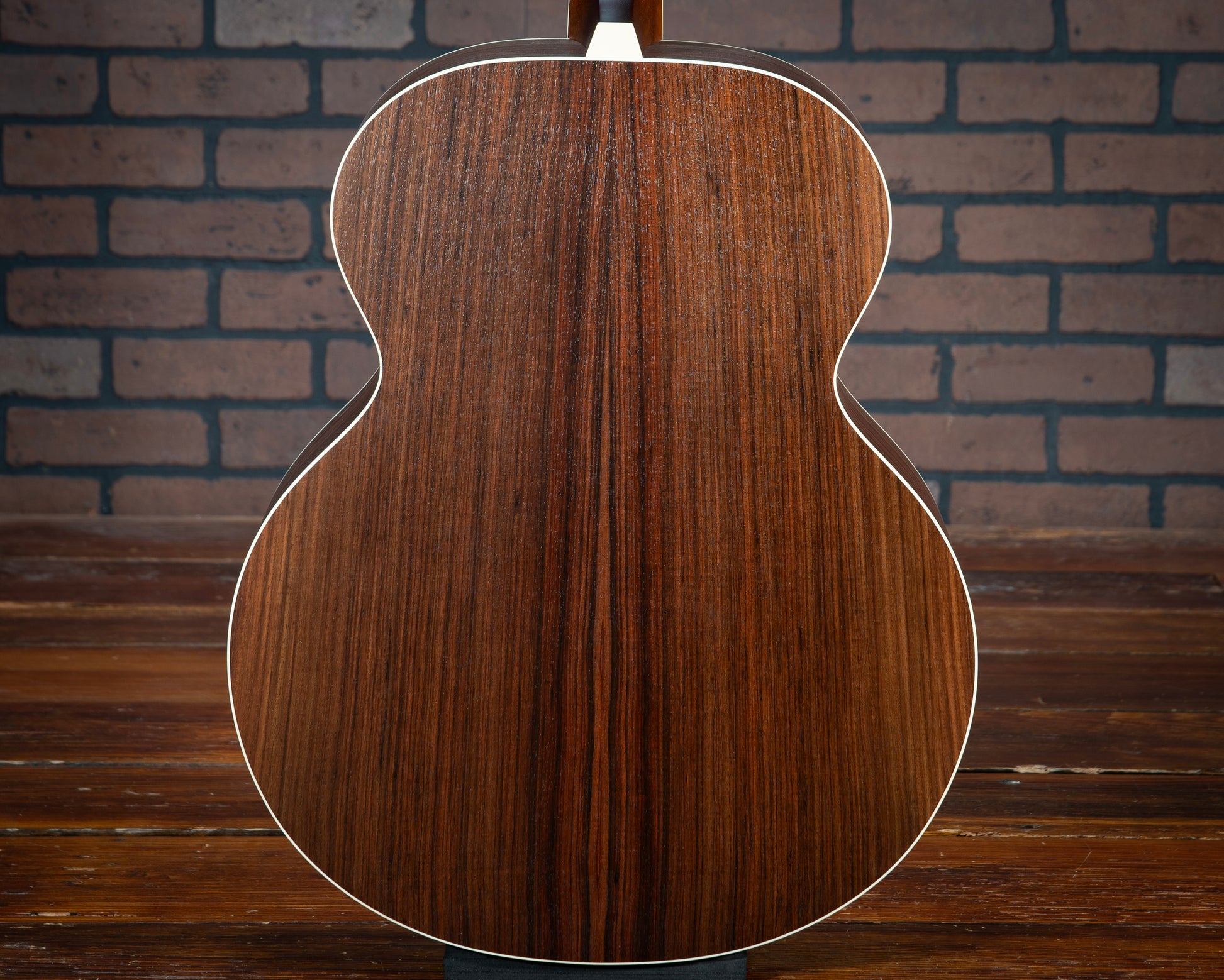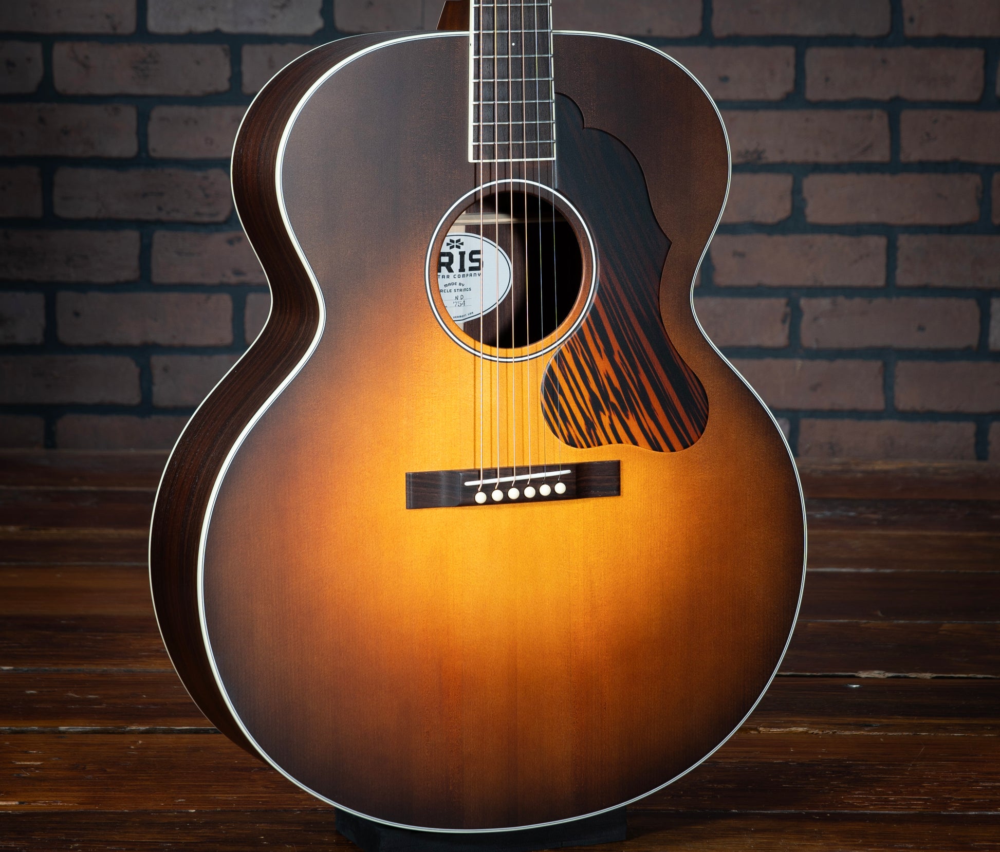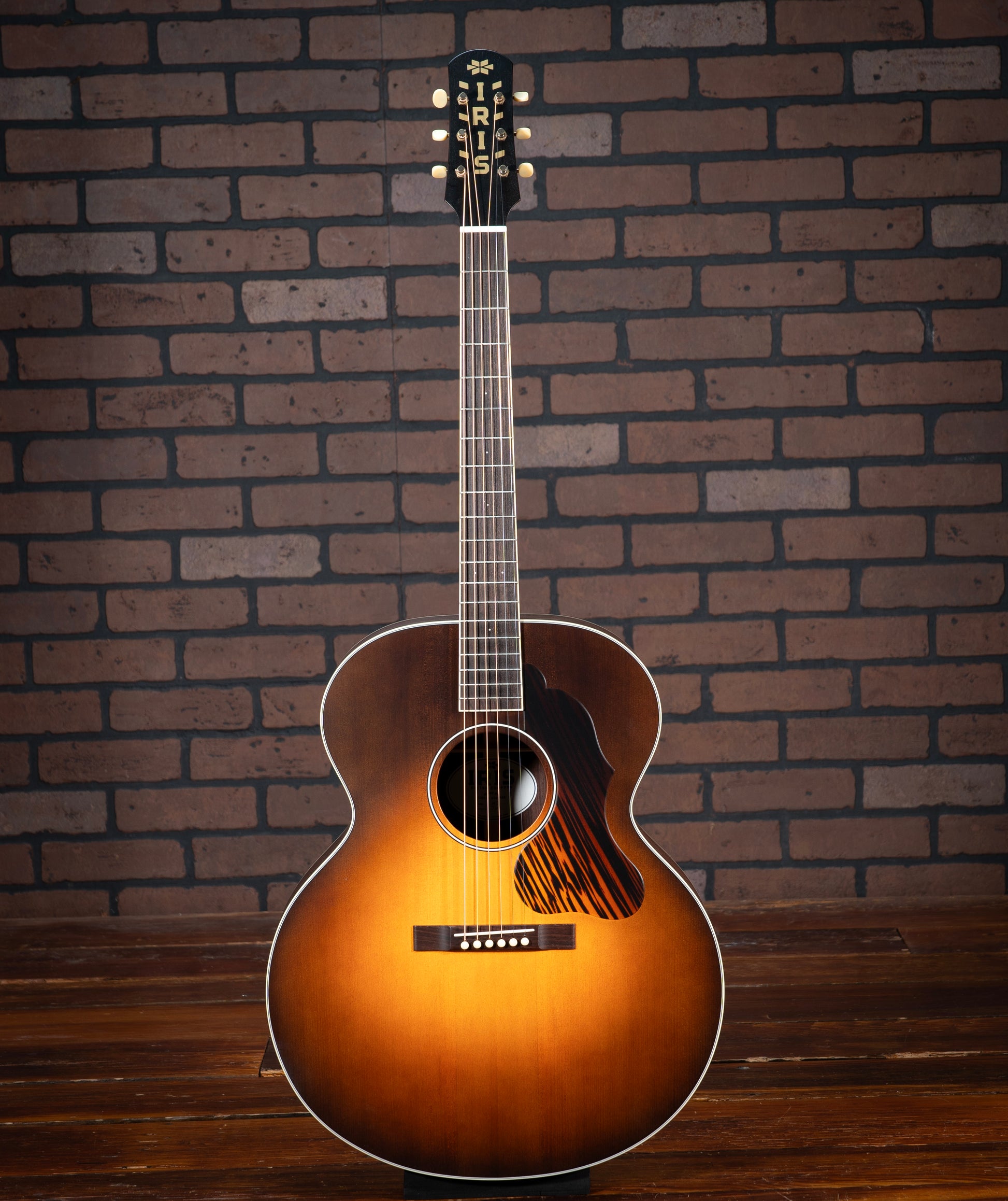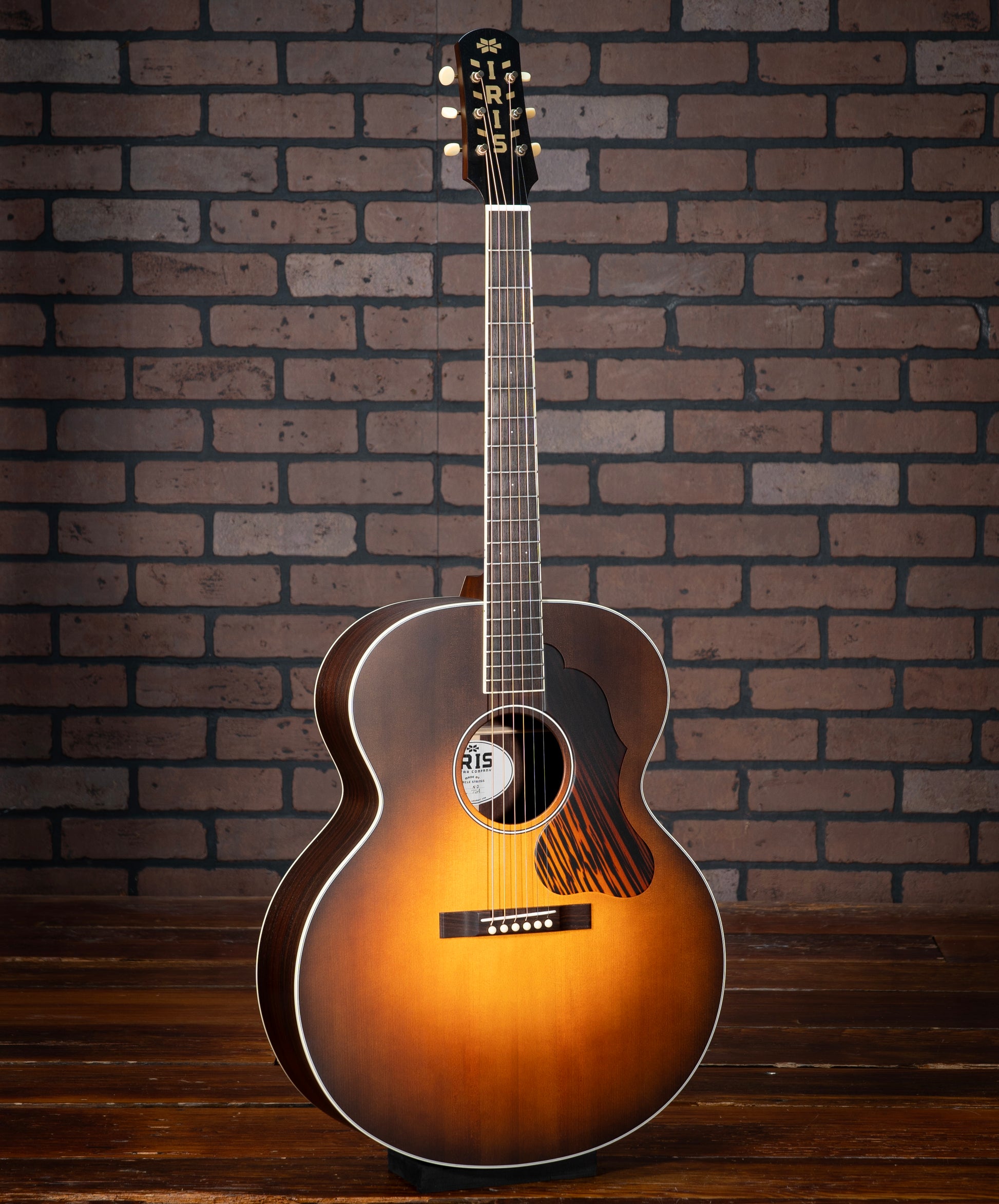 Iris ND-200 Burst – The first Iris Jumbo, the ND-200 is named after the company's head luthier, Nick Durkee. The ND-200 has a 25.5” scale and sounds huge! Neck width comes in at 1-11/16”. It has a warm and dry voice, with an nice midrange response. It takes equally well to being strummed with a pick or fingerpicked, in standard or open tunings, and it has a generous amount of headroom and projection. This guitar features rosewood back and sides, a solid Spruce top, Golden Age Relic brass tuners with off white buttons and a bone nut and saddle. The guitar pictured is the exact instrument that is for sale with hardshell case included. All instruments are available at our store showroom in Warrenton, Virginia, and are set up by our luthiers to the buyer’s personal specifications at no additional charge. All instruments are guaranteed to be packed safely and freshly set up per your specifications. Please email or call and we’d be happy to provide an in-hand description of the instrument and answer any questions you have.